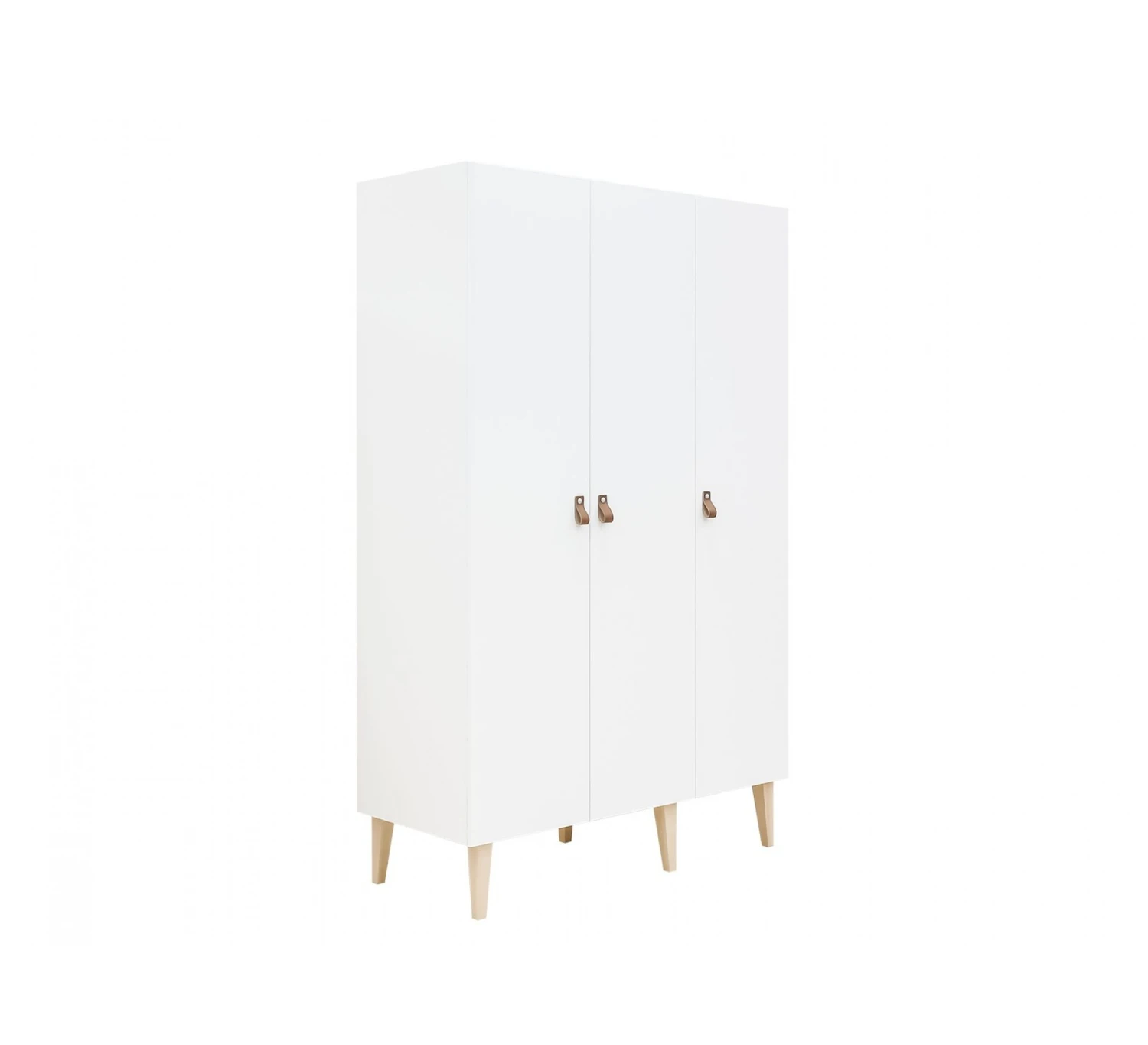 De 3-deurskast van de serie Indy is voorzien van lederen handgrepen. De ranke pootjes zijn utigevoerd in beukenhout. Afgewerkt met een lak op waterbasis, dat milieu- en kindvriendelijk is. Achter de linkse en middelste deuren bevinden zich twee legplanken en een hangroede. Achter de rechter deur geven de vier legplanken veel opbergmogelijkheden.