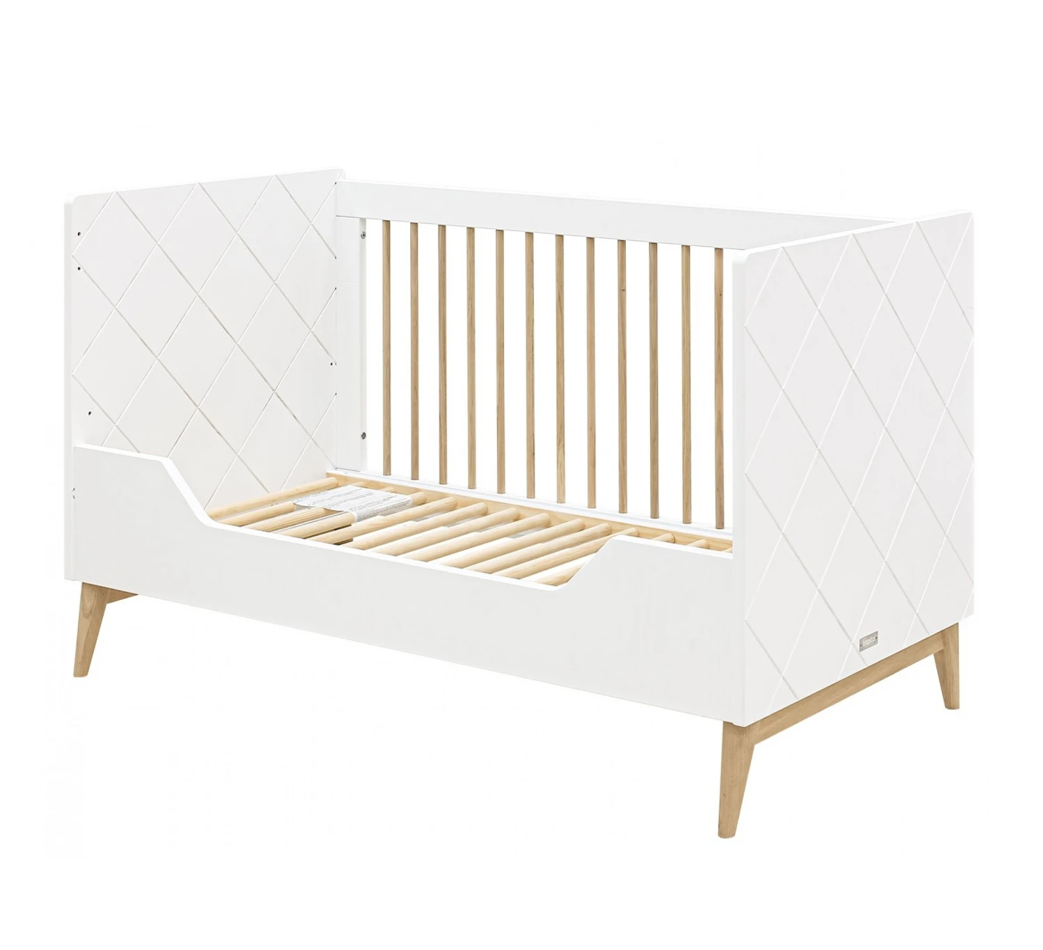 Dit Paris ledikant van Bopita is om te bouwen van een babybed met spijlen naar een peuter bedbank zodat de klein zelf kan in- en uitstappen en hieraan kan wennen. Het bed is afgewerkt in een combinatie van wie en naturel gelakt eikenhout. Bedbodem, spijlenrek en lage zijde voor de bedbank worden standaard met het bedje meegeleverd. Bij gebruik van het spijlenbed is de bedbodem in hoogte verstelbaar. Het formaat blijft na ombouwen hetzelfde, waardoor 1 matras (maat 90×140 cm) volstaat. Hierdoor heb je er dus extra lang plezier van. Let op: Dit bed is niet om te bouwen naar een cotbed variant, er is altijd 1 spijlenzijde aanwezig.