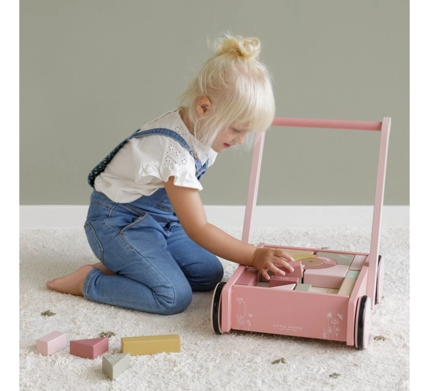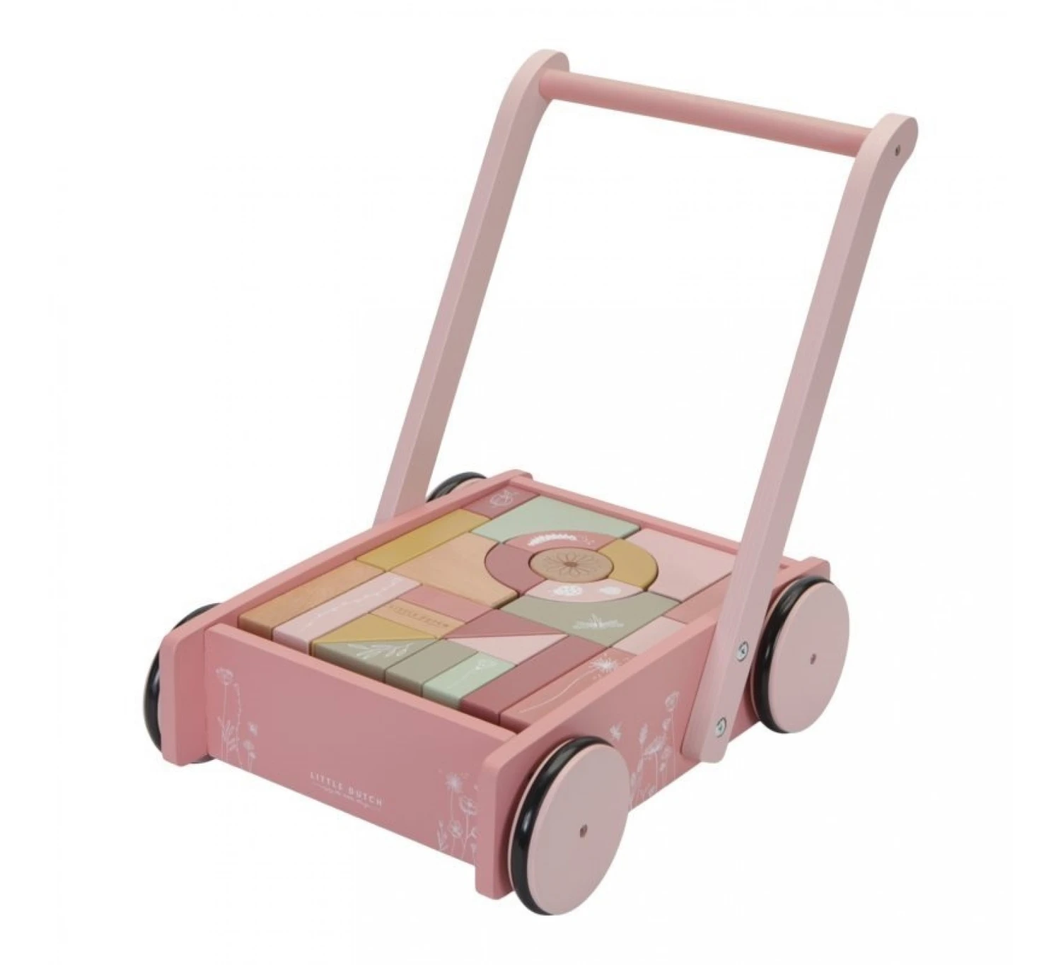De Little Dutch blokkenkar is voorzien van houten wieltjes en gevuld met gekleurde houten blokken met daarop prachtige tekeningen van bloemen en insecten uit de Wild Flowers collectie. De verschillende maten van de blokken bevorderen de herkenning van kleuren en vormen door kinderen. Het handvat zit op de juiste hoogte voor peuters zodat ze fijn door de kamer kunnen stappen. Deze vrolijke kar vol blokken staat garant voor urenlang bouwplezier.