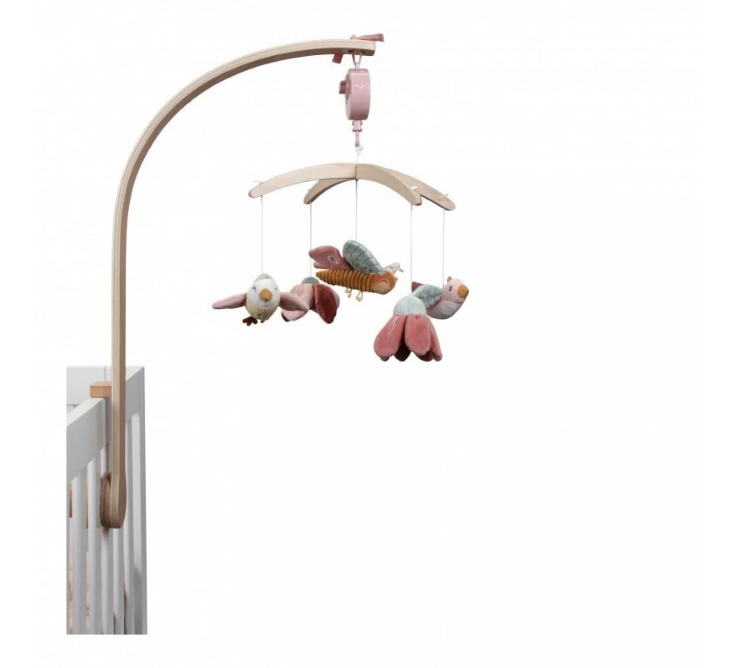 Deze mooie houten Little Dutch muziekmobiel werkt rustgevend voor baby’s dankzij het lieve slaapliedje. Aan de mobiel hangen vijf speeltjes uit de Flowers & Butterflies collectie: twee bloemetjes, het kleine vogeltje Olivia, Abby de mus en Lily de vlinder. Baby’s kijken graag naar de beweging van deze speeltjes, wat hun visuele ontwikkeling stimuleert. De muziekmobiel is geschikt vanaf de geboorte en eenvoudig te bevestigen aan het kinderbed of de box.