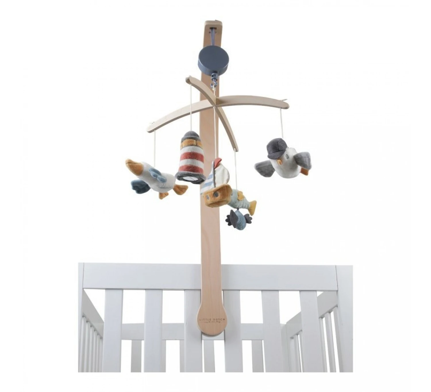 Deze mooie houten Little Dutch muziekmobiel werkt rustgevend voor baby’s dankzij het lieve slaapliedje. Aan de mobiel hangen vijf speeltjes uit de Sailors Bay collectie: een zeilbootje, een vissen-duo, een vuurtoren, de pelikaan Joe en de meeuw Jack. Baby’s kijken graag naar de beweging van deze speeltjes, wat hun visuele ontwikkeling stimuleert. De muziekmobiel is geschikt vanaf de geboorte en eenvoudig te bevestigen aan het kinderbed of de box.