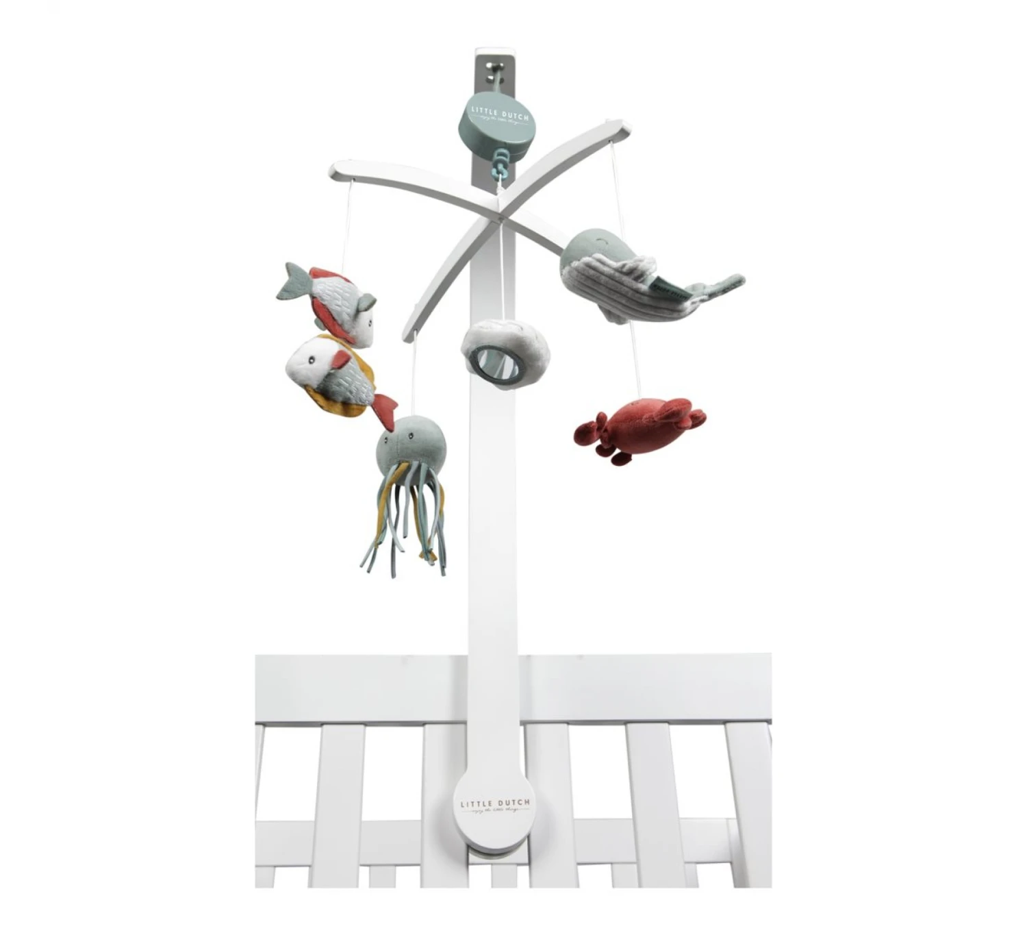Deze mooie houten Little Dutch muziekmobiel werkt rustgevend voor baby’s dankzij een lief slaapliedje. Aan de mobiel hangen vijf speeltjes met waterdieren in het Ocean-thema. Baby’s kijken graag naar de beweging van deze speeltjes, wat hun visuele ontwikkeling stimuleert.