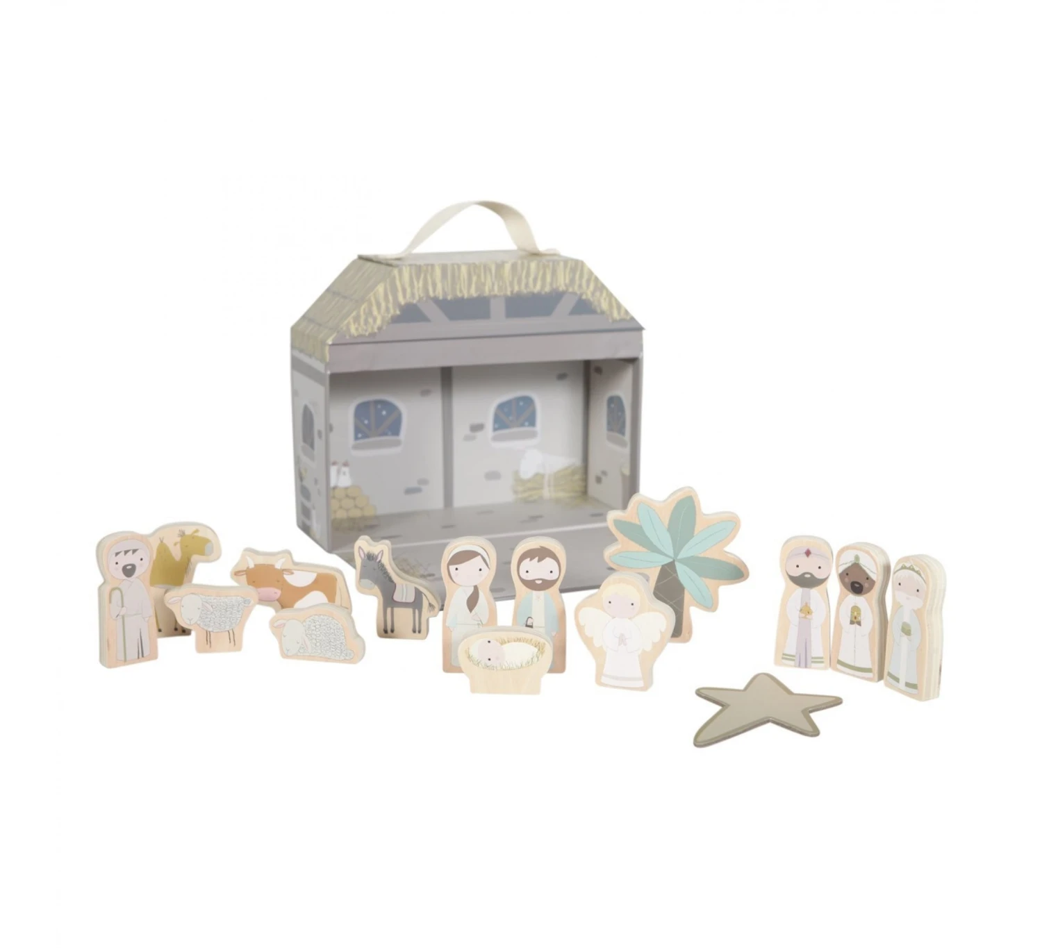 Met deze kerststal set kan je met alle figuren van het tradtitionele kerstverhaal na spelen. De set is gemakkelijk mee te nemen. De koffer en de ster is gemaakt van karton en de 14 figuren zijn gemaakt van hout.