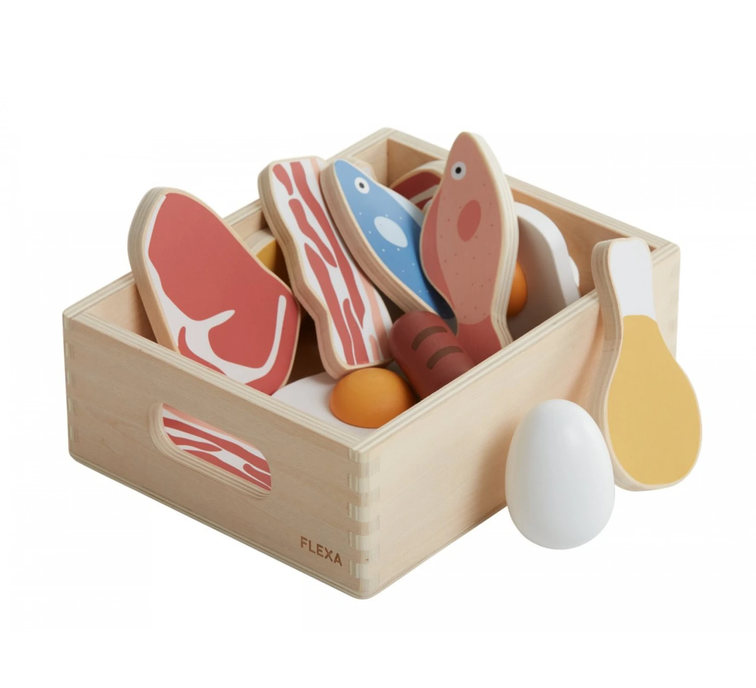 Laat je kindje heerlijk spelen in zijn of haar eigen Flexa keuken met deze houten vlees en vis speeltjes. Alle elementen uit deze set zijn volledig gemaakt van hout en passen bij de speelgoedkeuken van Flexa. De keuken is apart verkrijgbaar.