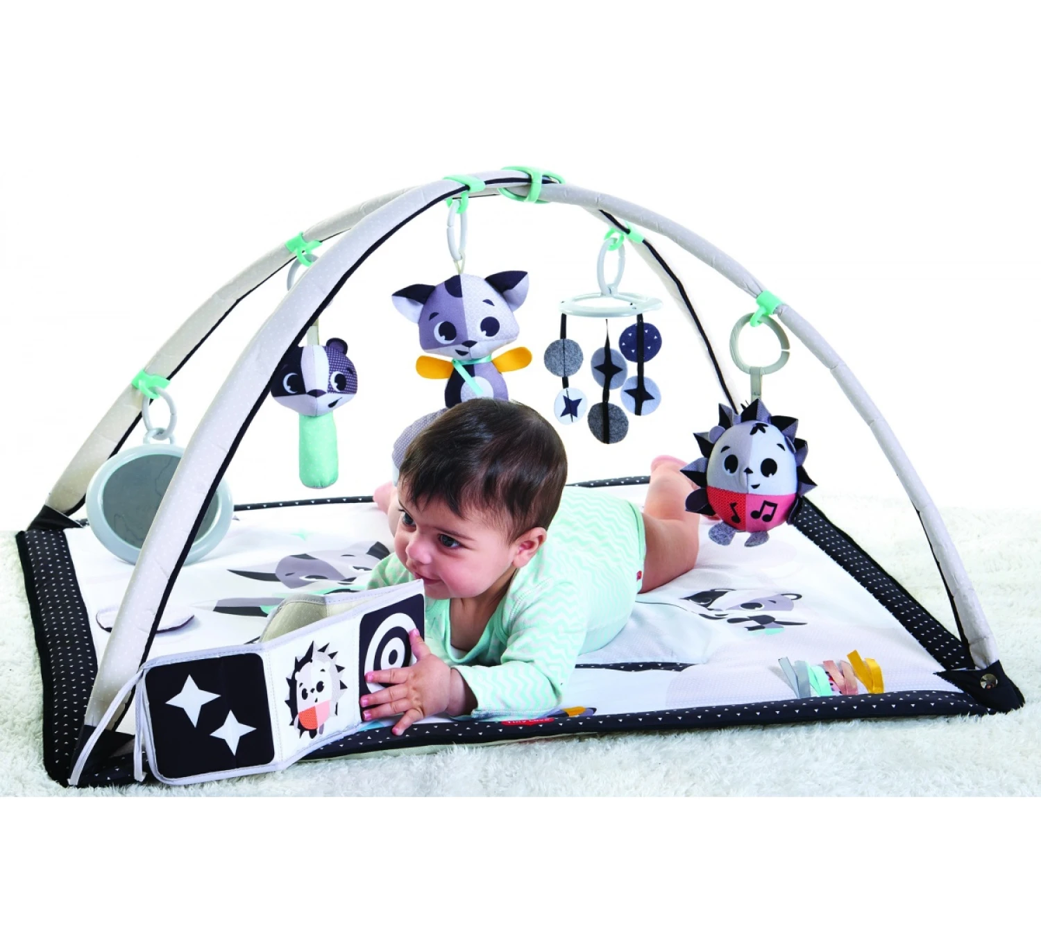 Speel en leer in stijl. De Magical Talesâ„¢ Black & White Gym is een feest voor zowel jouw als je baby’s ogen! De contrasterende zwarte en witte kleuren stimuleren het zicht van je baby en inspireren om te verkennen, te leren en te groeien. De verstelbare bogen passen zich aan je opgroeiende babytje aan, zodat hij of zij nog lang van de leuke activiteiten kan genieten. Ondertussen ontwikkelt je baby hiermee belangrijke vaardigheden zoals verbeeldingskracht, auditieve kennis, fysieke ontwikkeling en nog veel meer. De Magical Talesâ„¢ Black & White Gym bevat 18 verschillende ontwikkelingsactiviteiten die je kindje volop zullen vermaken. Het zachte opvouwbare boekje is inbegrepen bij de speelmat. Ook bevat de Gym leuke muziek en bijtspeeltjes. Het kleed is wasbaar in de wasmachine.